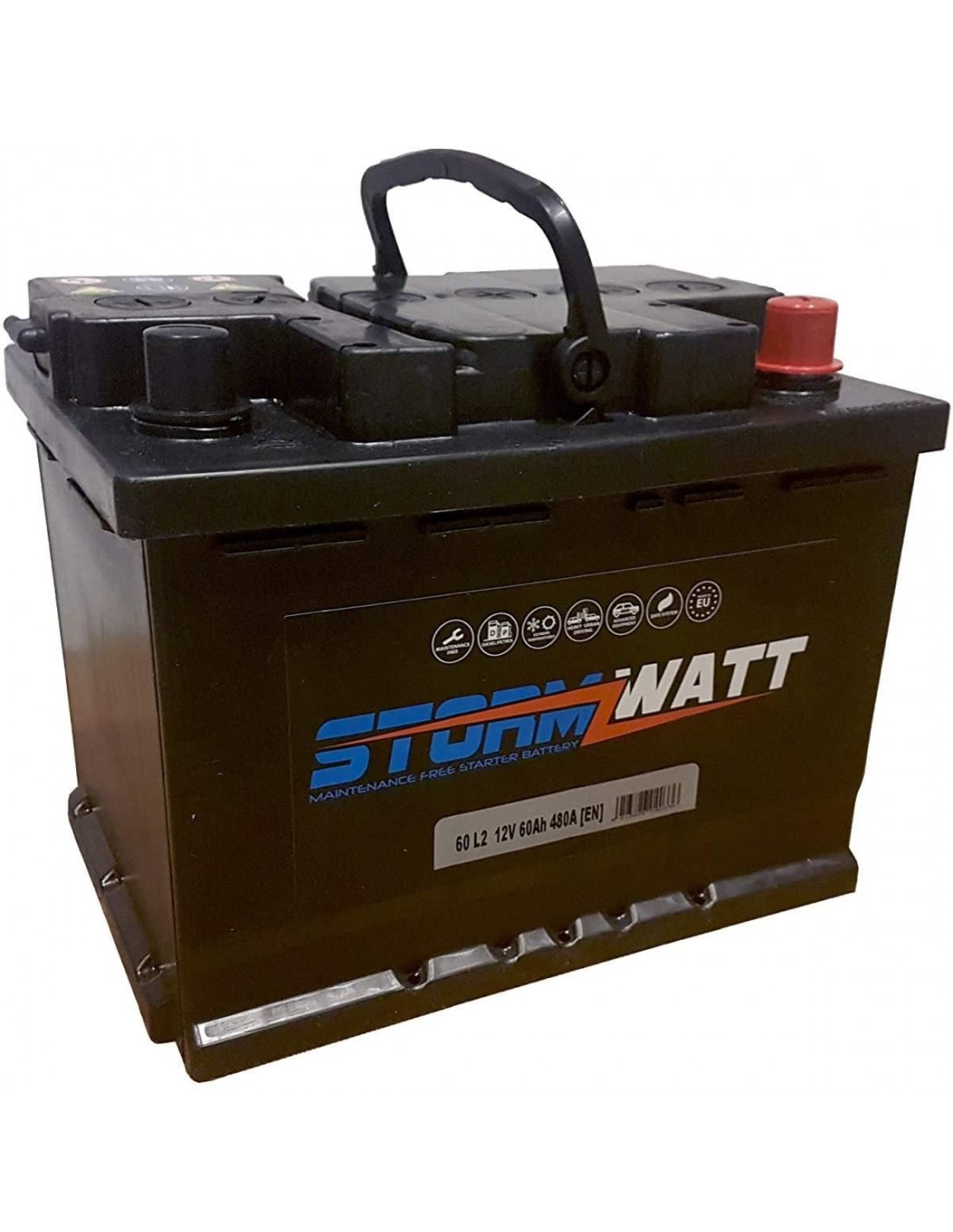 La batteria per auto del brand Stormwatt da 12 V e potenza di 70 AH ha polo positivo a destra.