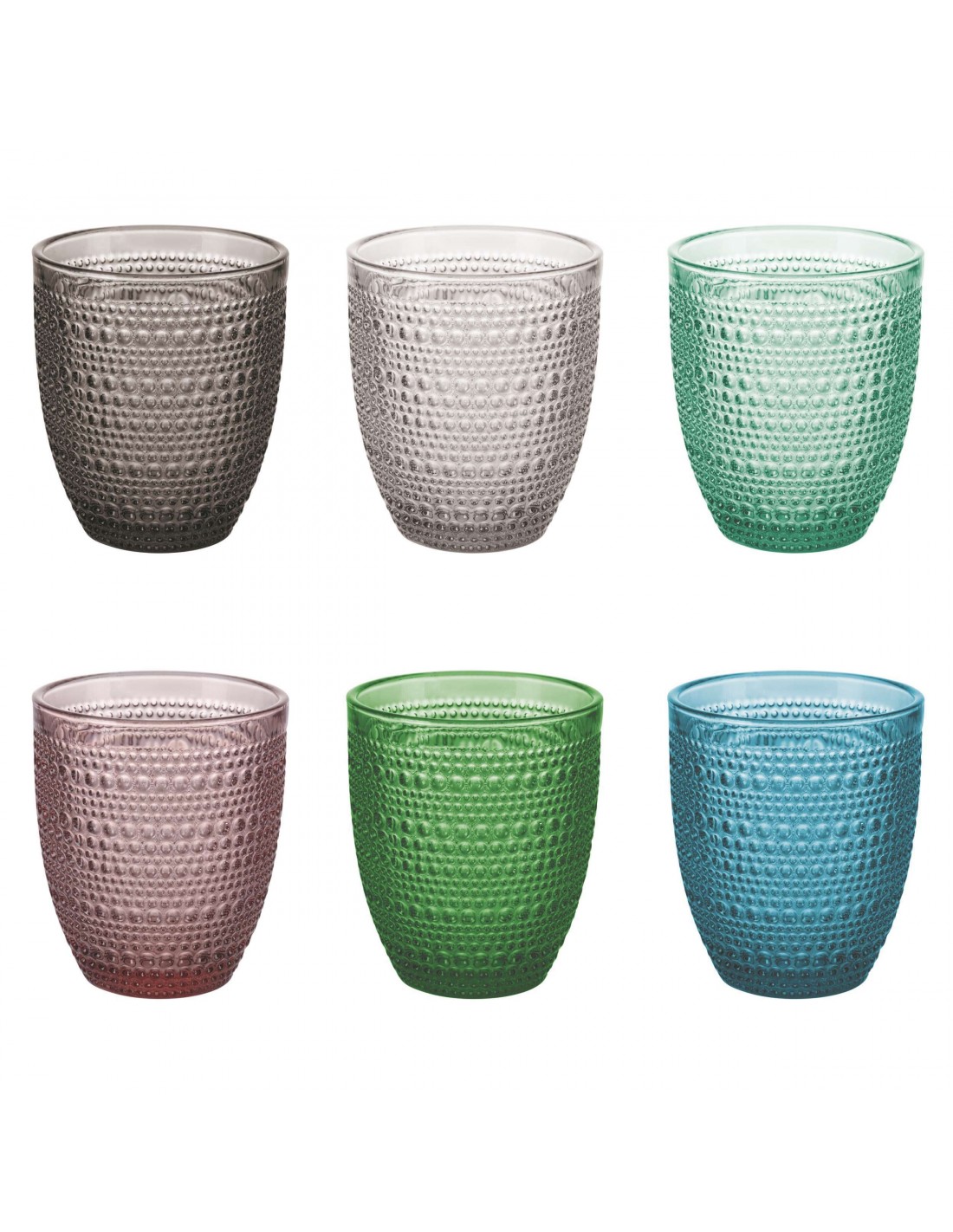 Il set si compone di 6 colori: verde, trasparente, viola, fumè, blu, azzurro
