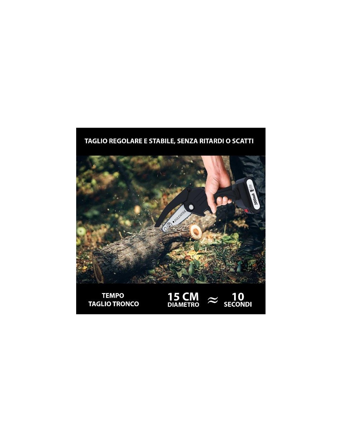 Rispetto alle seghe tradizionali, non necessita di benzina perchè è alimentata da una batteria al litio da 24V con 2000mah dalla ricarica veloce e che ne garantisce l'utilizzo fino a 3 ore.