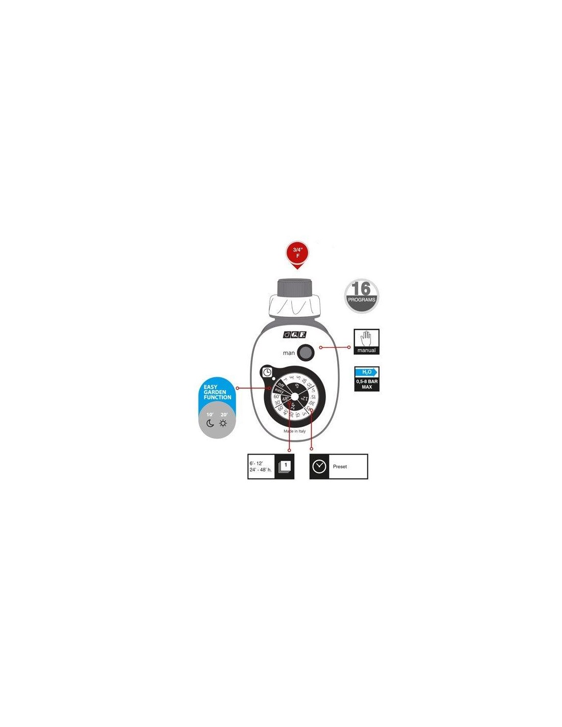 programmatore gf 16 easy dispone di programmi combinabili tra loro fino a 16+1 possibilità , gestibili attraverso il comodo selettore a manopola.
