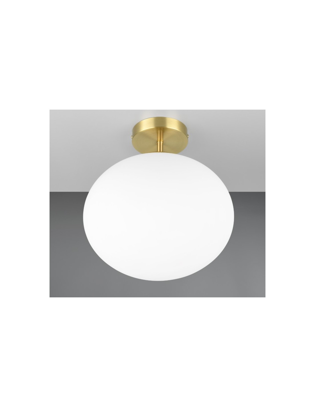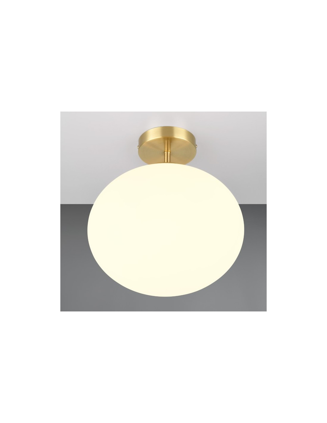 lampada da soffitto dal design elegante e moderno. Il corpo in metallo con finitura ottone satinato è abbinato a un diffusore sferico in vetro opalino bianco, che diffonde una luce soffusa e uniforme. Ideale per ambienti interni come soggiorno, sala da pranzo o corridoio, aggiunge un tocco di lusso e raffinatezza all'ambiente.