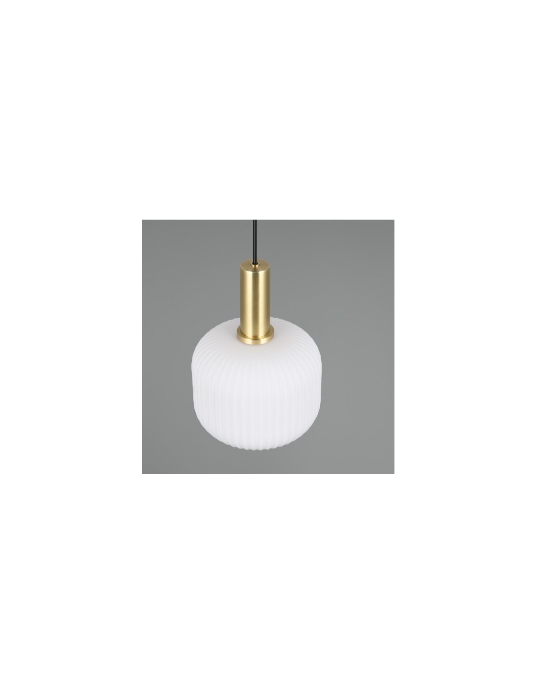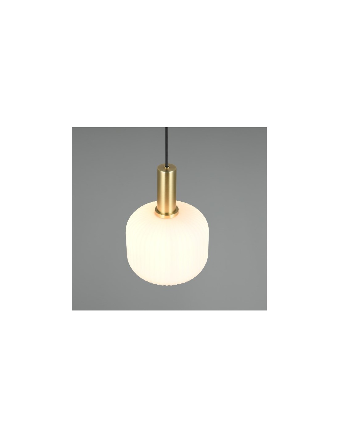 lampada a sospensione dal design elegante e moderno. Il corpo in metallo con finitura ottone satinato è abbinato a un diffusore sferico in vetro opalino bianco, che diffonde una luce soffusa e uniforme. Ideale per ambienti interni come soggiorno, sala da pranzo o corridoio, aggiunge un tocco di lusso e raffinatezza all'ambiente.