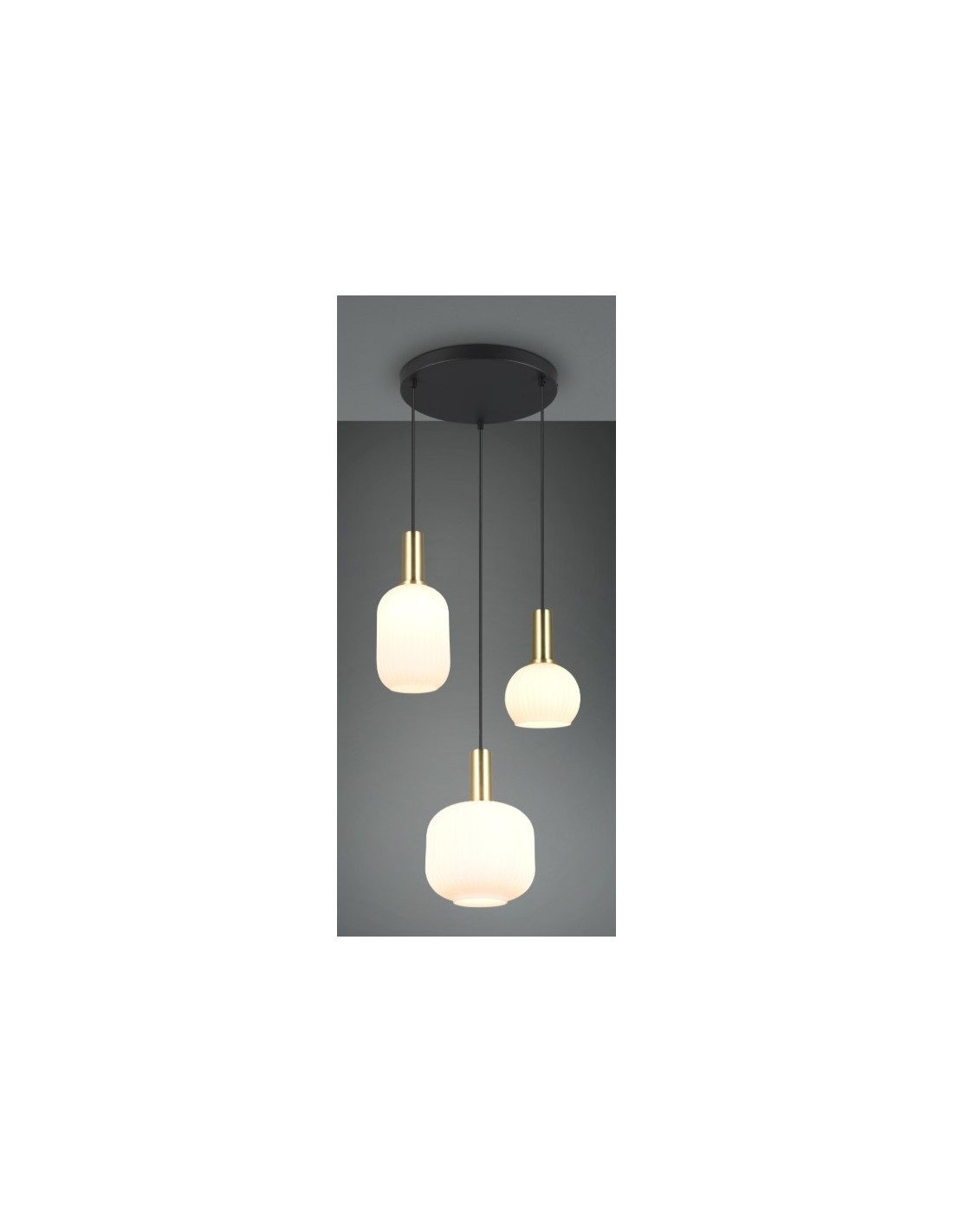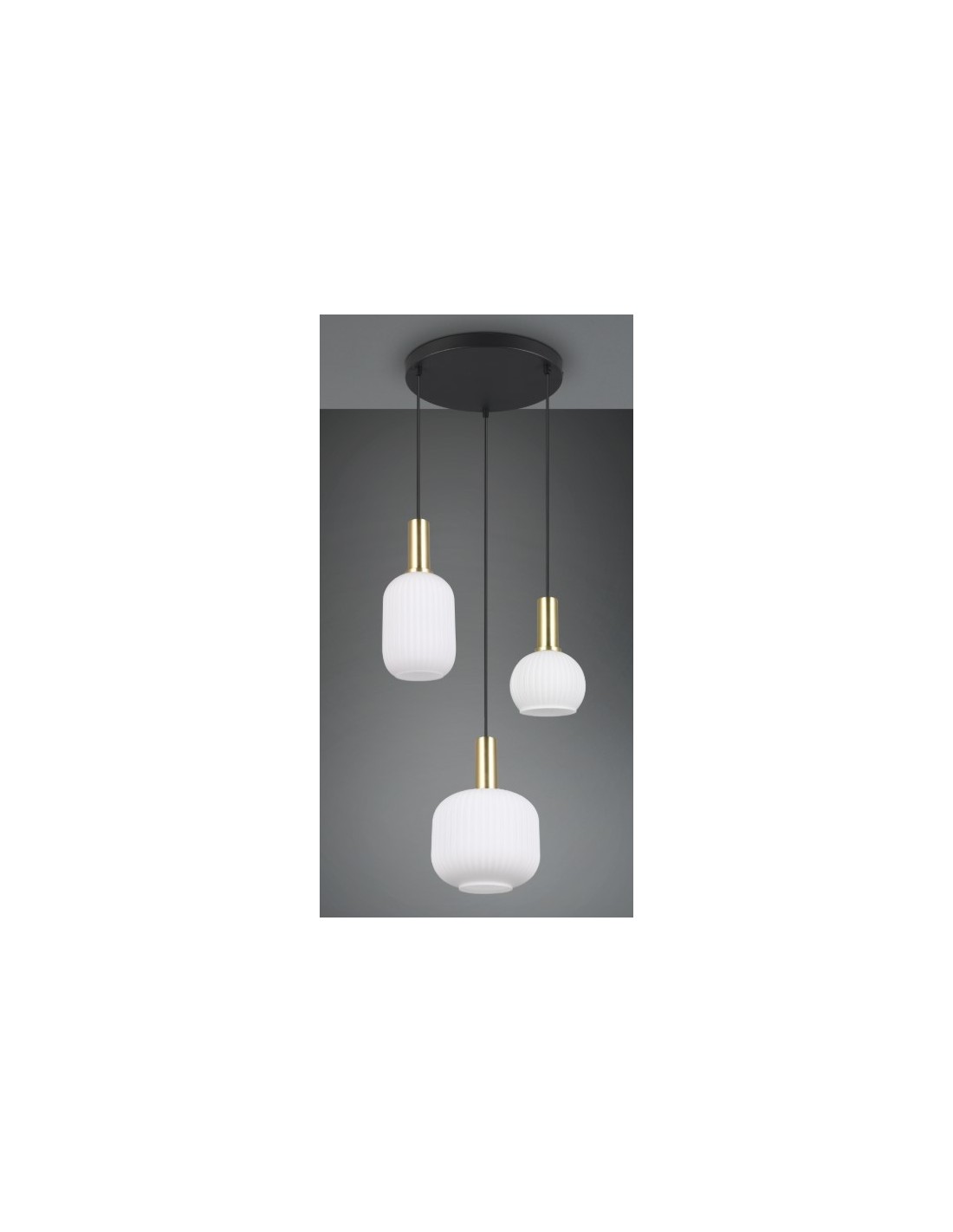 lampada a soffitto dal design elegante e moderno. La struttura in metallo con finitura nero opaco e ottone satinato è abbinata a tre diffusori sferici in vetro opalino bianco rigato, che diffondono una luce soffusa e uniforme. Ideale per ambienti interni come soggiorno, sala da pranzo o corridoio, aggiunge un tocco di lusso e raffinatezza all'ambiente.