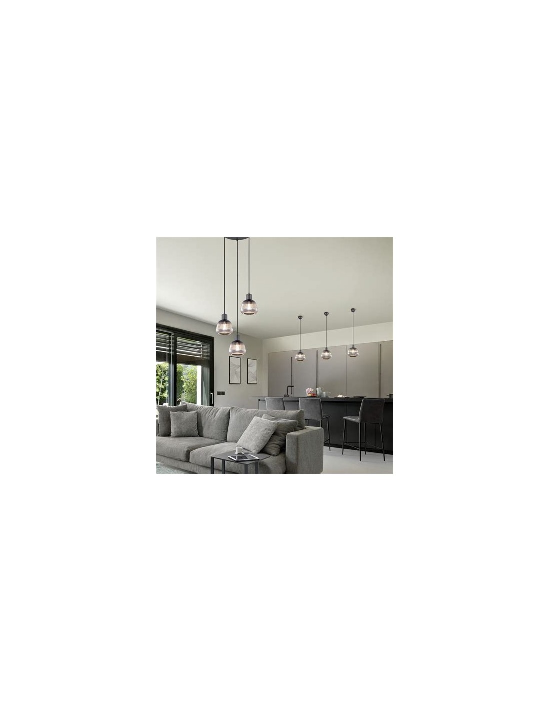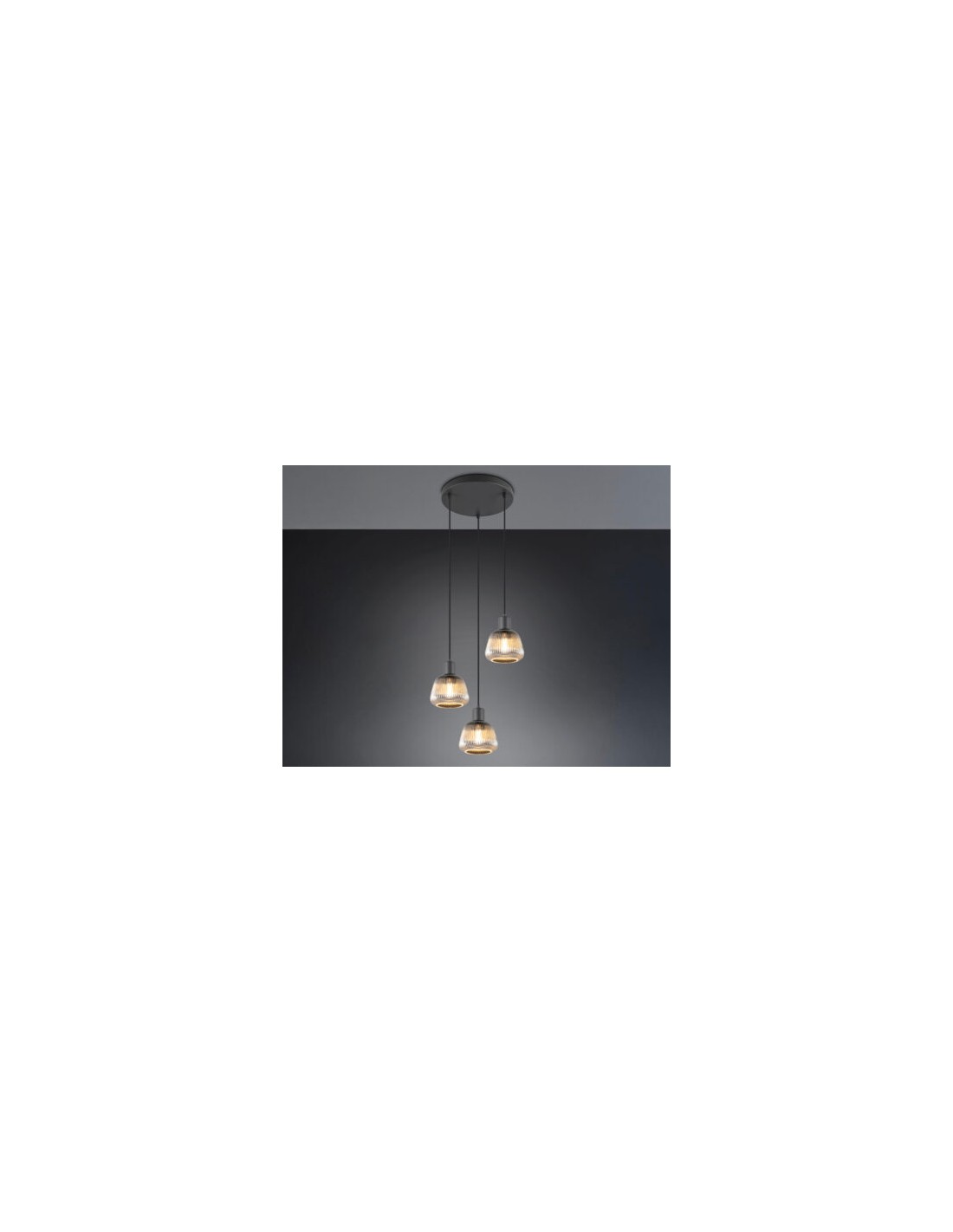 La lampada a sospensione Tarifa con 3 luci è una scelta elegante e moderna per ambienti come soggiorni, sale da pranzo o cucine. Presenta una struttura in metallo nero opaco e paralumi in vetro rigato color cromo, che diffondono una luce calda e accogliente. La lunghezza totale è regolabile fino a 150 cm, con un diametro del paralume di 25 cm, ideale per illuminare tavoli o isole cucina.